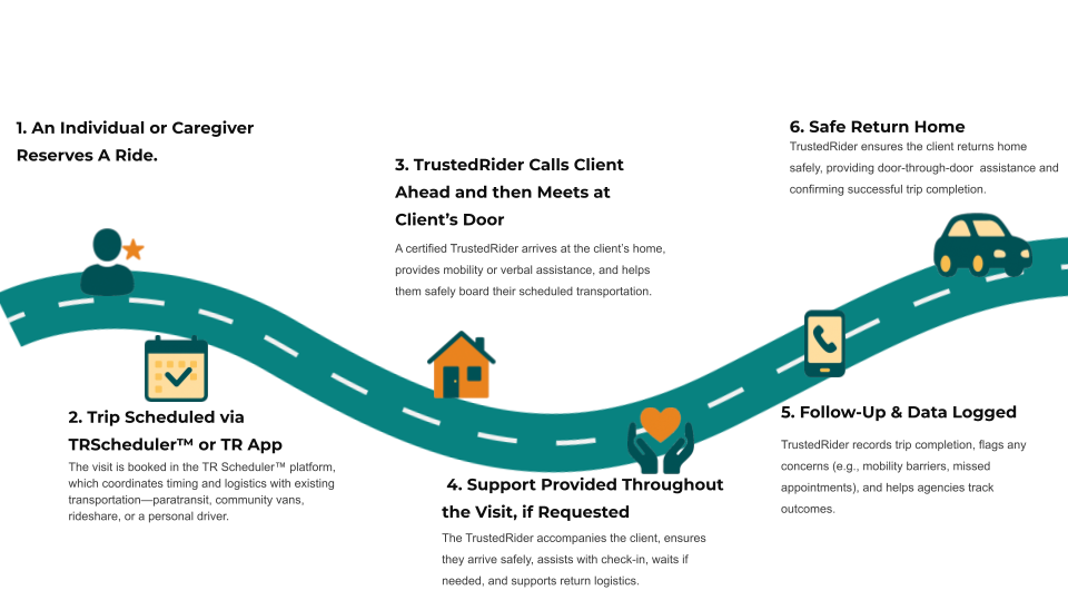 TrustedRiders provides non-medical, door-through-door human support and coordination around pre-arranged trips, whether by walking or with any form of ground transportation arranged through partners.